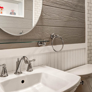 A white washstand accented with satin nickel hardware is fitted with a corian countertop holding
